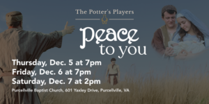 The Potter’s Players present Peace to You, a musical rendition of the Christmas story. At a grand celebration, prodigal son Oren shares the story of how an encounter with his cousin Joseph, Joseph’s bride Mary, and their unborn son brought him hope and changed his heart and his life forever. With a cast of over…