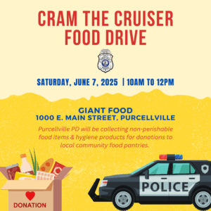 On Saturday, June 7, from 10 a.m. to 12 p.m., the Purcellville Police Department will once again partner with Giant Food, located at 1000 East Main Street, Purcellville, to Cram the Cruiser with non-perishable food and hygiene items. All donations will be distributed to local food pantries/community organizations to support our neighbors in need. Items…