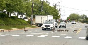 Early Tuesday morning on May 14, a very important large family is seen crossing Main Street at the crosswalk, in the vicinity of Giant Foods – perhaps to get some vittles.