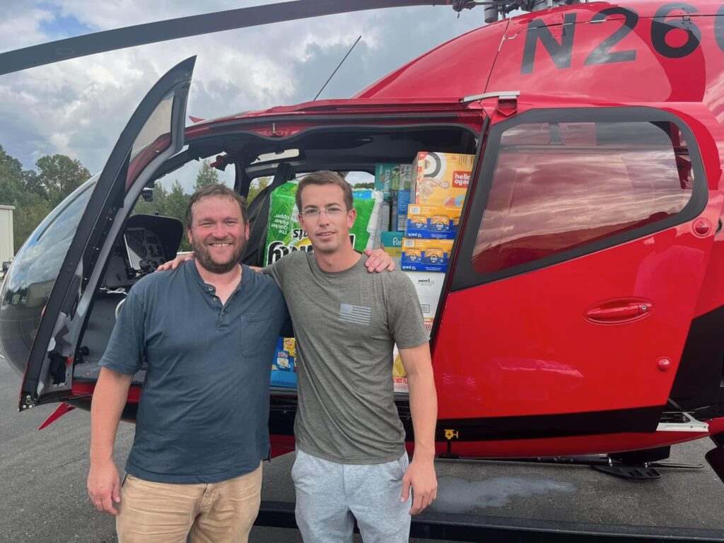Kuhn Aviation’s Justin Jordan with Scott Kuhn in front of helicopter they flew down to Asheville area to deliver supplies.