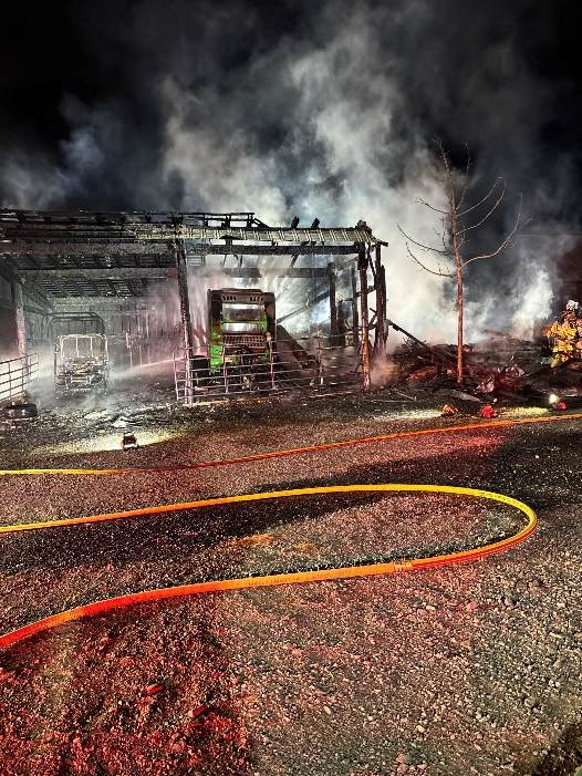 Based on the column of smoke observed by responding units and the area not having fire hydrants, a Tanker Task Force was requested to assist with water supply. Upon arrival, crews found a 50×50 barn fully involved and quickly began an exterior fire attack. There were several structures nearby, however, the fire was contained to the barn of origin, which was primarily used for storage with no animals inside.