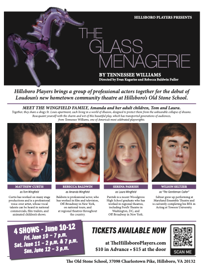 Leading the cast will be Matthew Curtis, in the role of Tom Wingfield, who is Tennessee Williams’ alter ego in the play. Curtis has worked on many stage productions and is a professional voice-over artist whose vocal talents can be heard in national commercials, film trailers, and animated children’s shows. Widely sought after in major commercial markets, he chooses to reside here in Loudoun County by maintaining a professional recording studio in his home.