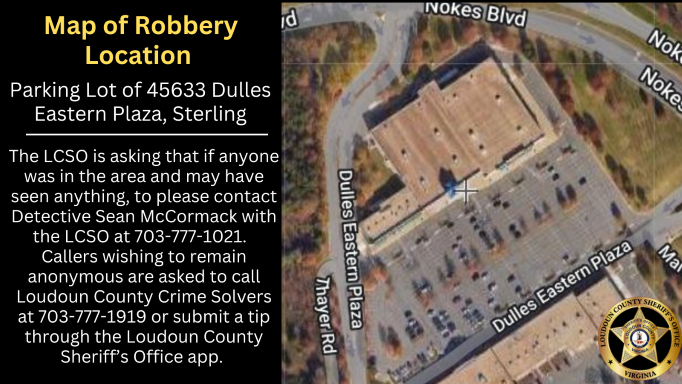 Loudoun County, VA (February 26, 2023) – The Loudoun County Sheriff’s Office is investigating an armed robbery that occurred on Feb. 25, at Dulles Town Crossing in Sterling.