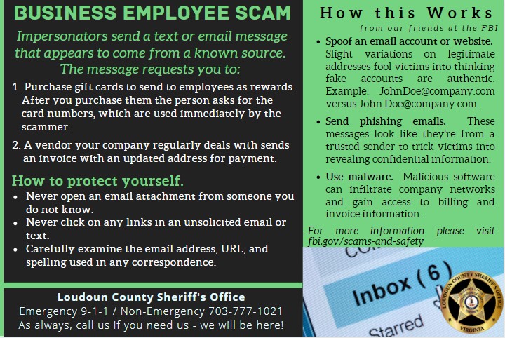 The LCSO Financial Crimes Unit reminds residents and business owners to carefully examine email addresses, URLs, and spelling used in any correspondence. Never open an email attachment from someone you do not know, and never click on any links in an unsolicited email or text. If you are a resident of Loudoun County and believe you or your company were a victim of a scam, please contact the Loudoun County Sheriff’s at 703-777-1021 or file a report online at http://sheriff.loudoun.gov/reportonline.