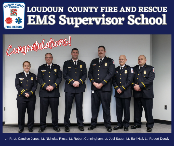 On Tuesday, April 9, six members of Loudoun County Fire and Rescue graduated from the County’s Emergency Medical Services Supervisor School. Upon completion of their field ride-time, the Loudoun County Combined Fire and Rescue System EMS system will have 19 Paramedics that are qualified to fill the EMS Supervisor role.