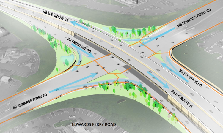 The project consists of the development of a new grade-separated interchange on Edwards Ferry Road at the Rt. 15 bypass and will include the intersection of Ft. Evans Road. New crosswalks and sidewalks will be built along with a new shared-use path along westbound Fort Evans Road.