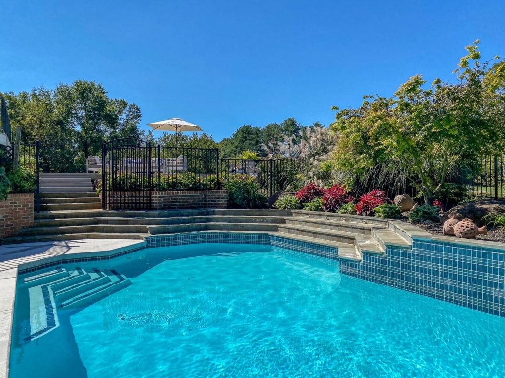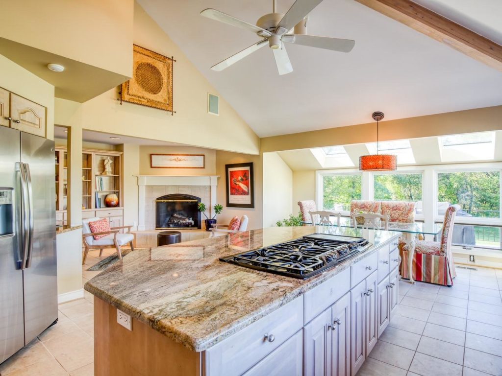 The welcoming kitchen-dining area is lined by windows and fitted with granite counters, stainless steel appliances, and built-in cabinetry. A cozy area with bookshelves and wood-burning fireplace sits opposite the kitchen area. From this space, French doors open to the formal dining room overlooking the pool, which can be reached by a tiered deck. Together, this is a wonderful space for indoor/outdoor entertaining. And you’d be hard-pressed to find a more convenient setup for quick party cleanup or a post-swim shower than the combination walk-in pantry, laundry room/mudroom, and full bath off the kitchen.