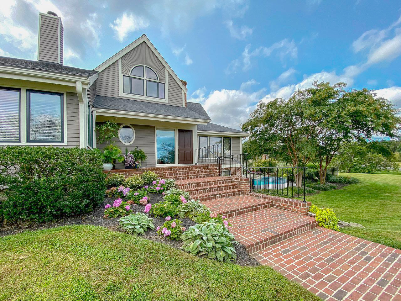 The welcoming kitchen-dining area is lined by windows and fitted with granite counters, stainless steel appliances, and built-in cabinetry. A cozy area with bookshelves and wood-burning fireplace sits opposite the kitchen area. From this space, French doors open to the formal dining room overlooking the pool, which can be reached by a tiered deck. Together, this is a wonderful space for indoor/outdoor entertaining. And you’d be hard-pressed to find a more convenient setup for quick party cleanup or a post-swim shower than the combination walk-in pantry, laundry room/mudroom, and full bath off the kitchen.