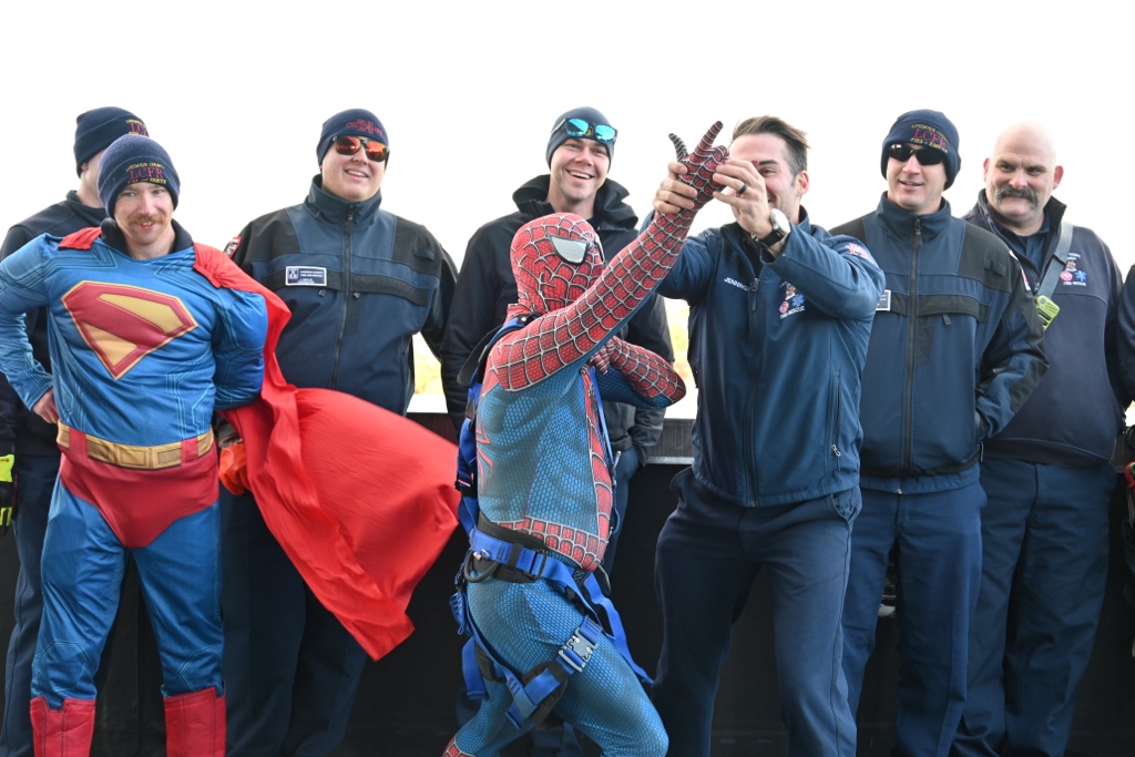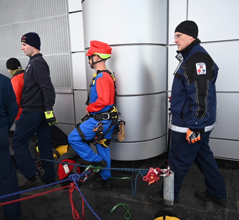 Lieutenant Jason Ilewite, dressed as Luigi, said the crew was thrilled to take part. “We’re here to bring a smile to kids who might not be able to go trick-or-treating this year,” he explained. It’s a great feeling for us to brighten their day—and it also gives our technical rescue team valuable high-angle training. It’s good all the way around, said Ilewite.