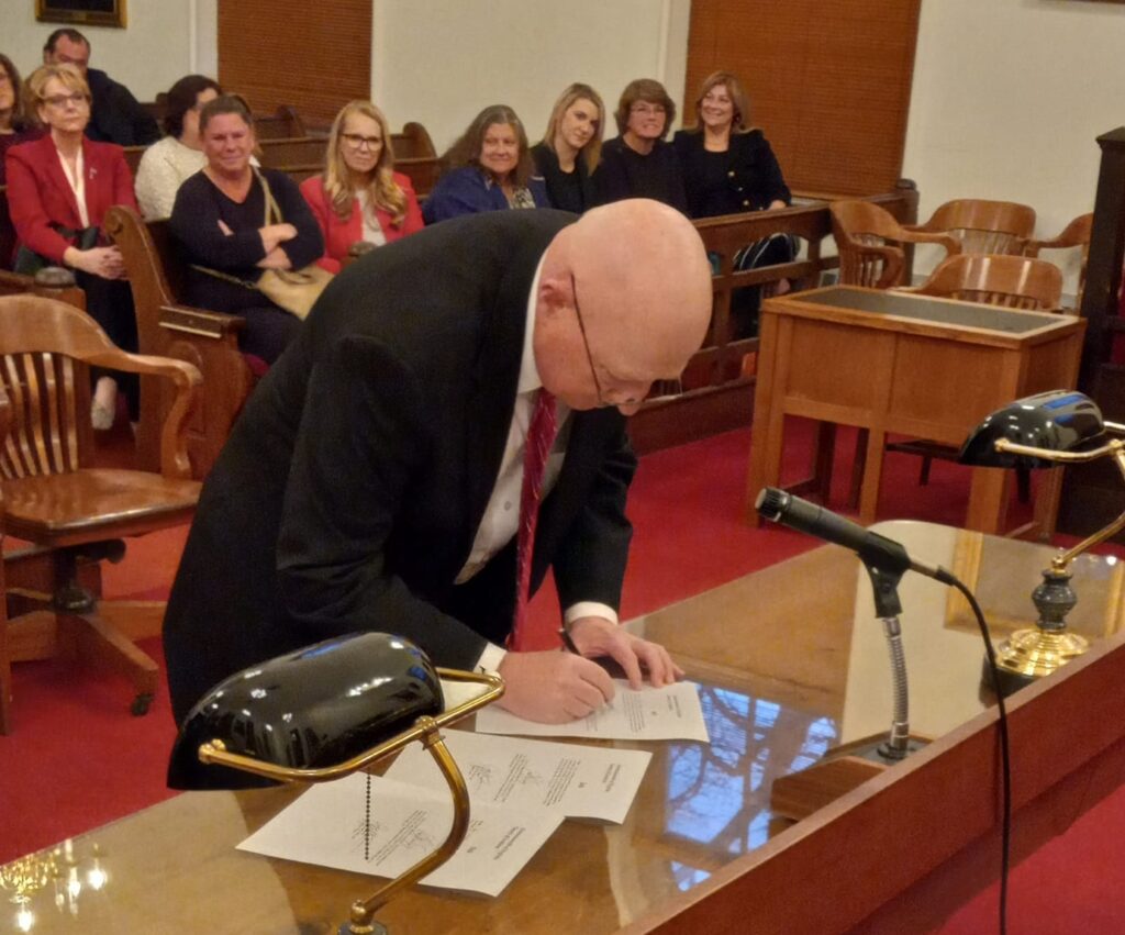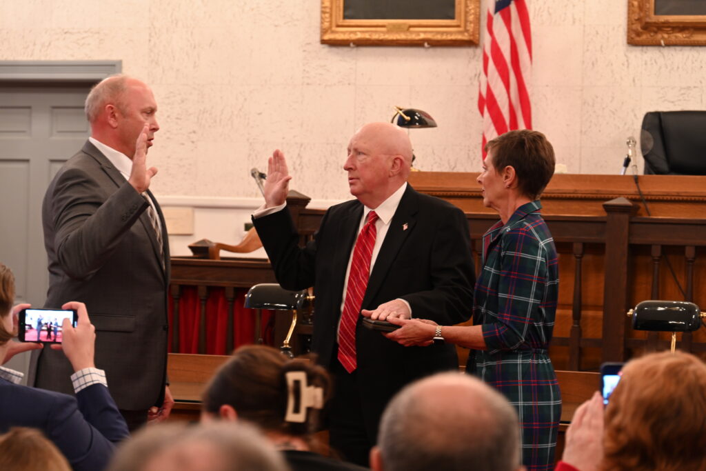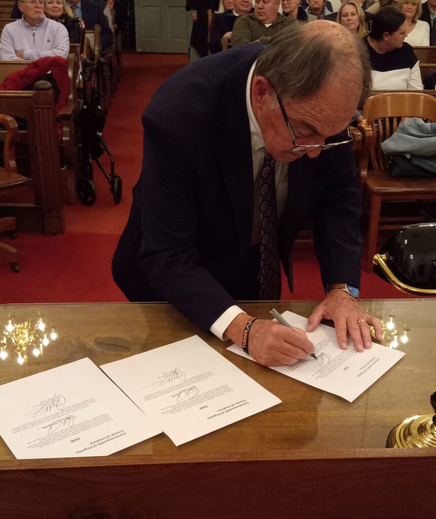 Henry Eickelberg and Bob Anderson sign paperwork in the old Leesburg Courthouse Dec. 4th after taking the oath of office for their respective new roles as Treasurer and Commonwealth’s Attorney.