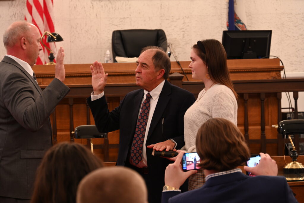 Bob Anderson used his late wife’s Bible while taking the oath of office for the Commonwealth’s Attorney Dec. 4th at the old Courthouse in Leesburg. In a touching sentiment, he spoke about his wife, Mary, saying he was sure she would be pleased looking down on him and his family and that he talks to her daily. “She was a pillar” of the family, he said. His granddaughter, Kaylee Ducharme, 17, held the Bible for him as he took the oath, and his children and younger grandchildren watched with pride as he began his new term.