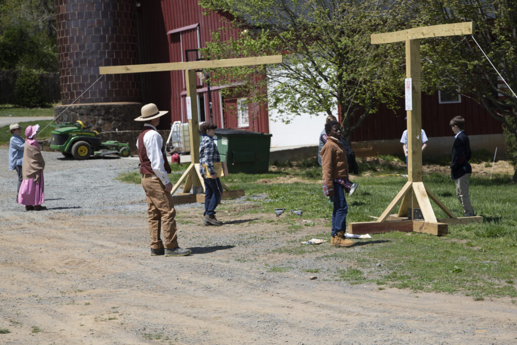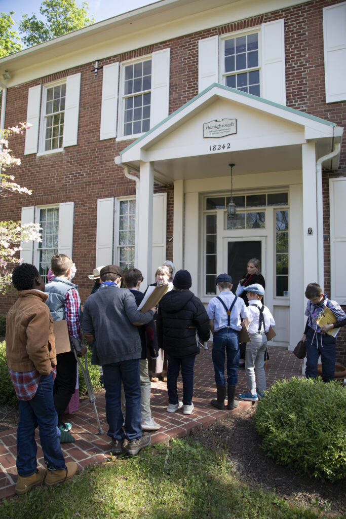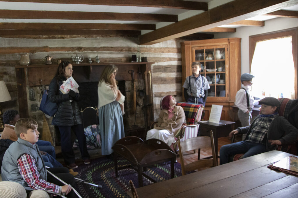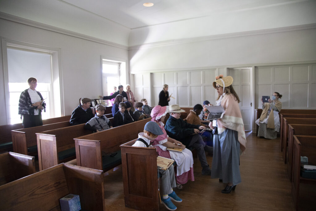 Greeted by docents at the Goose Creek Meetinghouse, students learn about its history, including its construction as a two-story building in 1817. In 1943, following three days of rain, a sudden windstorm destroyed the second story. It was war-time, and there was not enough material or money to rebuild the entire structure. Restoration as a one-story structure was completed in 1949.