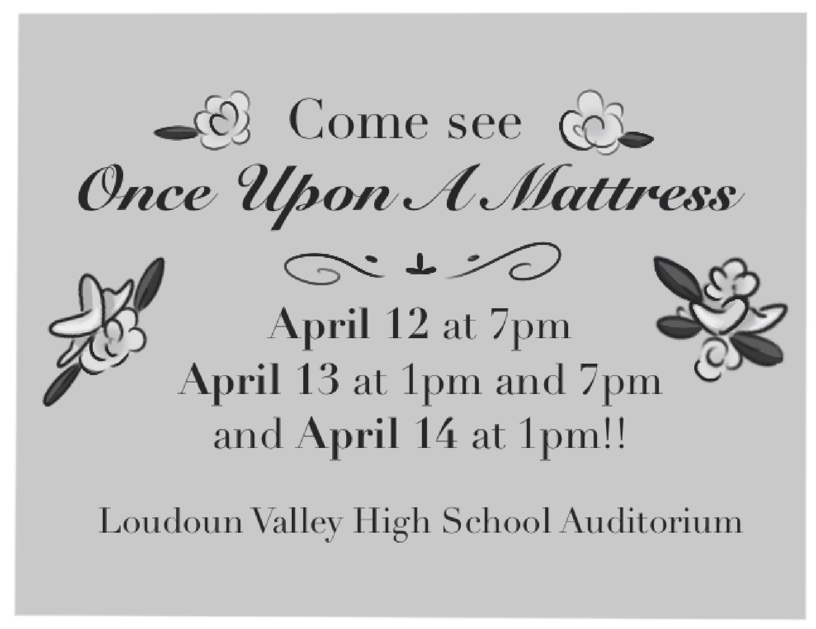 There are four show dates for Once Upon a Mattress: April 12 at 7 p.m., April 13 at 1 p.m. and 7 p.m., and April 14 at 1 p.m. Once Upon a Mattress is a one-of-a-kind show with large dance numbers and plenty of comedy throughout. Don’t sleep on Once Upon a Mattress, it’s a dream come true. Tickets available at https://loudounvhs.booktix.com/. LCPS Students are free.