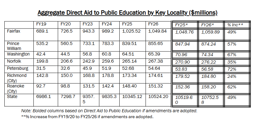 - Since the pandemic, direct aid to public education has increased by almost $7 billion to a total of over $21 billion for the FY25/ FY26 biennium if the Governor’s amendments are adopted. This is a nearly 50% increase.